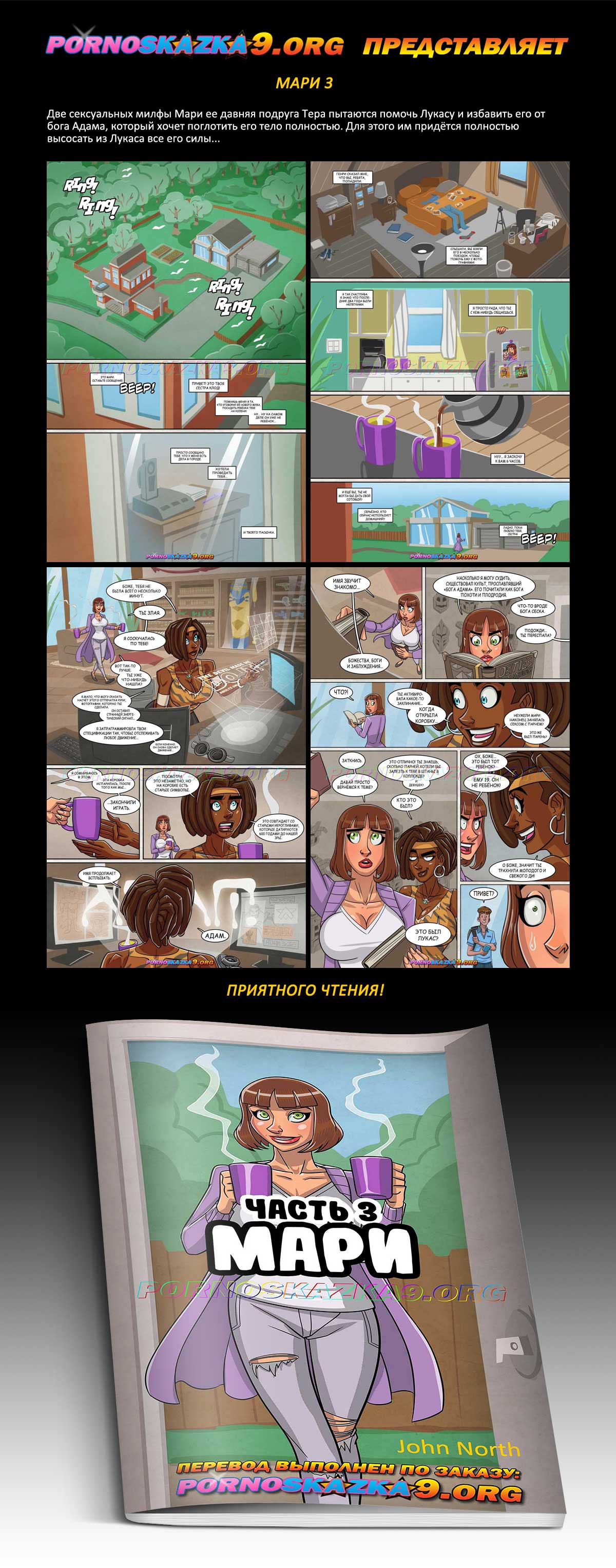 Порно комикс «Мари. Часть 3.» Две сексуальных милфы Мари ее давняя подруга Тера пытаются помочь Лукасу и избавить его от бога Адама, который хочет поглотить его тело полностью. Для этого им придётся полностью высосать из Лукаса все его силы…